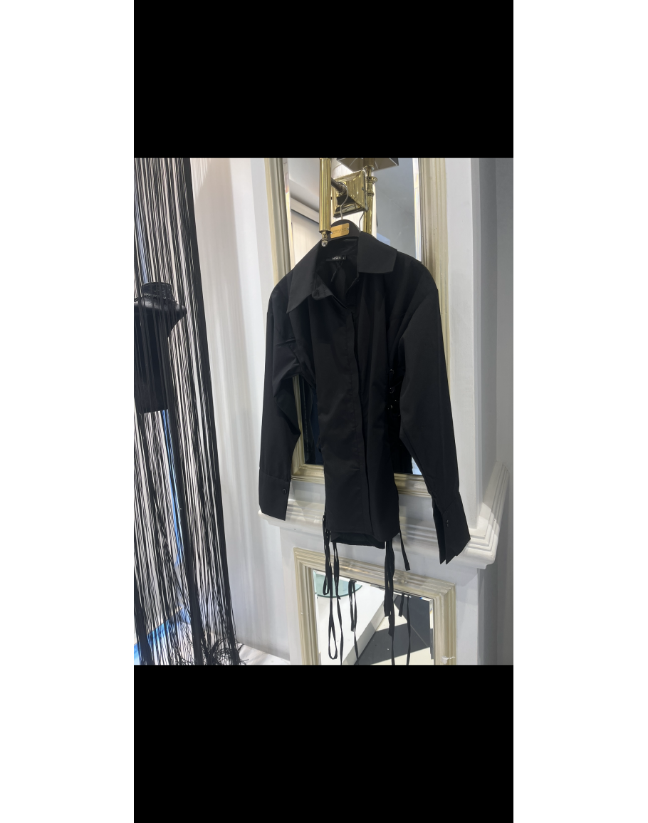 Modern kuşgözü ve bağcık detaylarıyla öne çıkan siyah bluz, güçlü ve iddialı tarzı bir arada sunar.