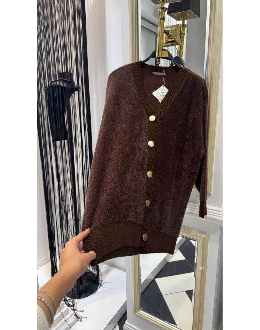 Yumuşak tüylü dokusu ve sıcak kahverengi tonu ile öne çıkan bu hırka, konforu şıklıkla buluşturur. Hafif ve akıcı yapısı sayesinde gün boyu rahat bir kullanım sunarken, sade tasarımı ile günlük kombinlerden şehir stiline kadar kolayca uyum sağlar. Serin havalarda stilinden ödün vermeden sıcak kalmak isteyenler için ideal bir parçadır.