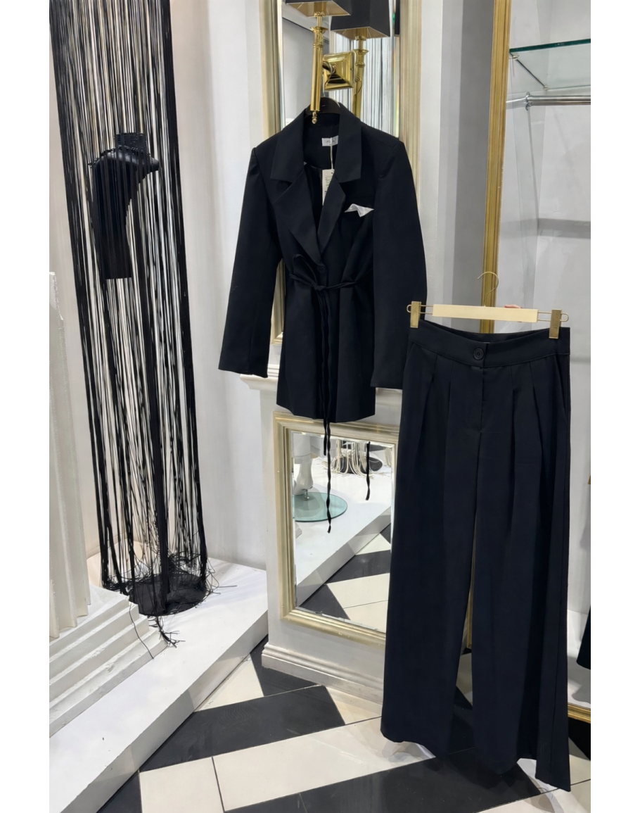 Siyah İkili Takım, zamansız rengi ve modern kesimiyle şıklığı zahmetsiz hale getirir. Pileli pantolonu hareket özgürlüğü sağlarken, üst parçasının rahat formu gün boyu konfor sunar.